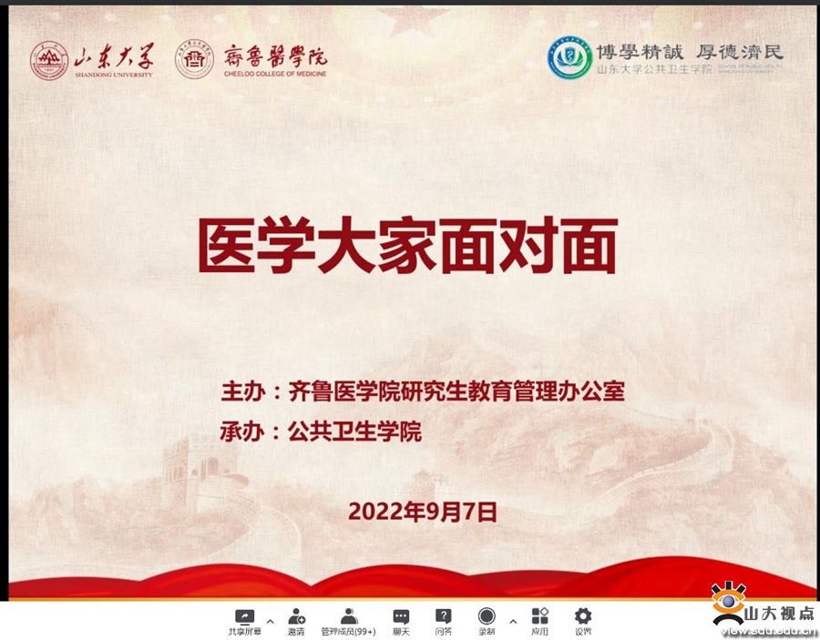 [本站讯]9月7日,齐鲁医学院举办“医学大家面对面”活动,活动由公共卫生学院承办。国家卫生健康委员会卫生经济与政策研究重点实验室主任李士雪、国家健康医疗大数据研究院院长薛付忠、公共卫生学院常务副院长孙强、公共卫生学院副院长席波作专题报告。齐鲁医学院副院长马春红出席活动并致辞,活动由公共卫生学院副院长马伟主持,600余名师生“云端”相聚。