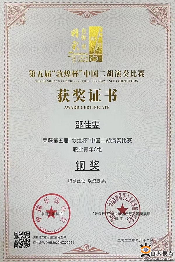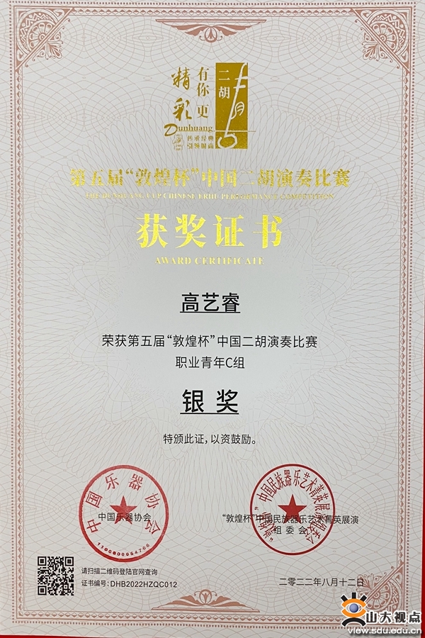 [本站讯]在刚刚结束的第五届“敦煌杯”中国二胡演奏比赛中,山东大学艺术学院2020级本科生高艺睿、邵佳雯荣获职业C组银奖、铜奖,指导教师韩璐荣获优秀辅导教师奖。