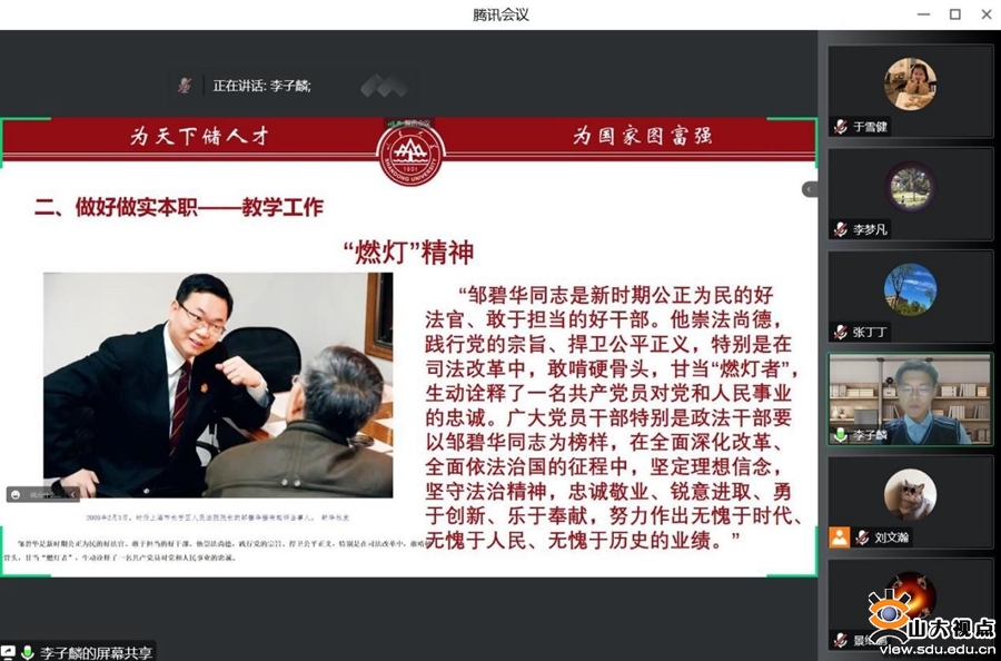 活动首先进行榜样模范交流分享。山东大学第22届研支团成员李子麟以“做传承燃灯者精神的‘山岩’”为题,从支教地简介、教学工作、志愿服务三个方面做了分享。李子麟曾赴山西省石楼县东风小学支教一年,并且在为异地扶贫搬迁社区的孩子们做志愿辅导时,他了解到一个孩子家庭十分困难,于是将1000元托人转交给了孩子,真正做到了“燃灯扶智,义无反顾”八个字。