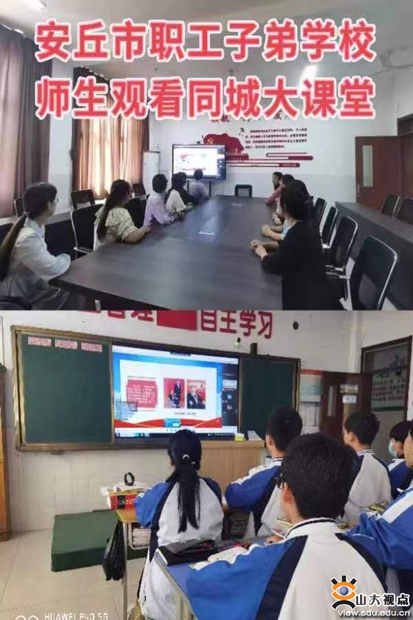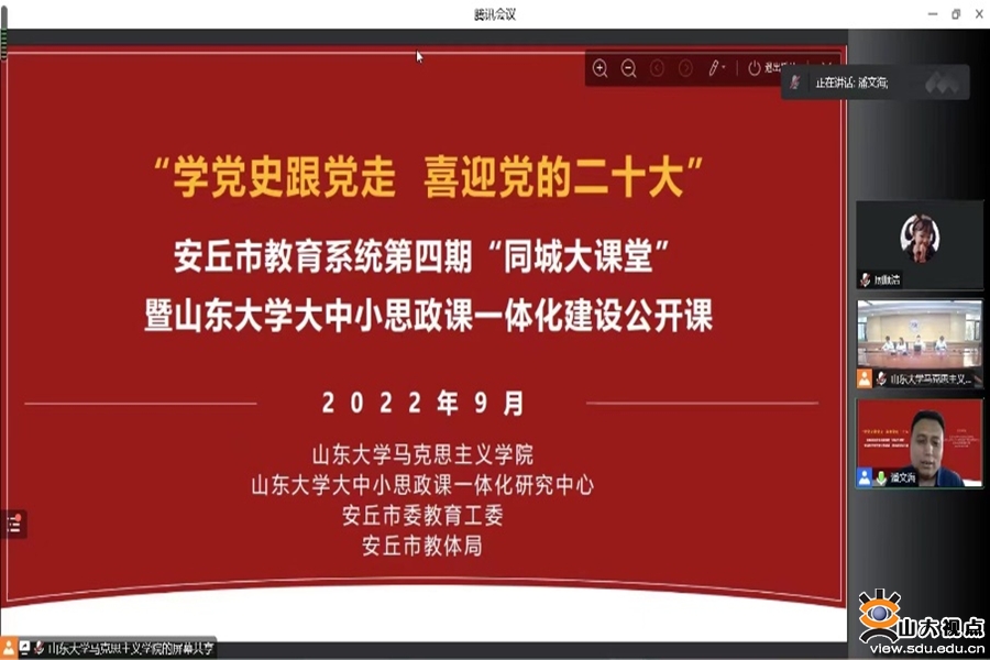 [本站讯]为巩固党史学习教育成果,进一步提升思政课建设质量,喜迎党的二十大胜利召开,9月29日下午,山东大学马克思主义学院、山东大学大中小思政课一体化研究中心、安丘市教体局联合开展了以“学党史跟党走 喜迎党的二十大”为主题的思政课“同城大课堂”活动。山东大学马克思主义学院党委副书记王海宁,山东大学大中小思政课一体化研究中心主任、马克思主义学院副院长郑敬斌,安丘市教体局思政课教研员潘文海参加活动。