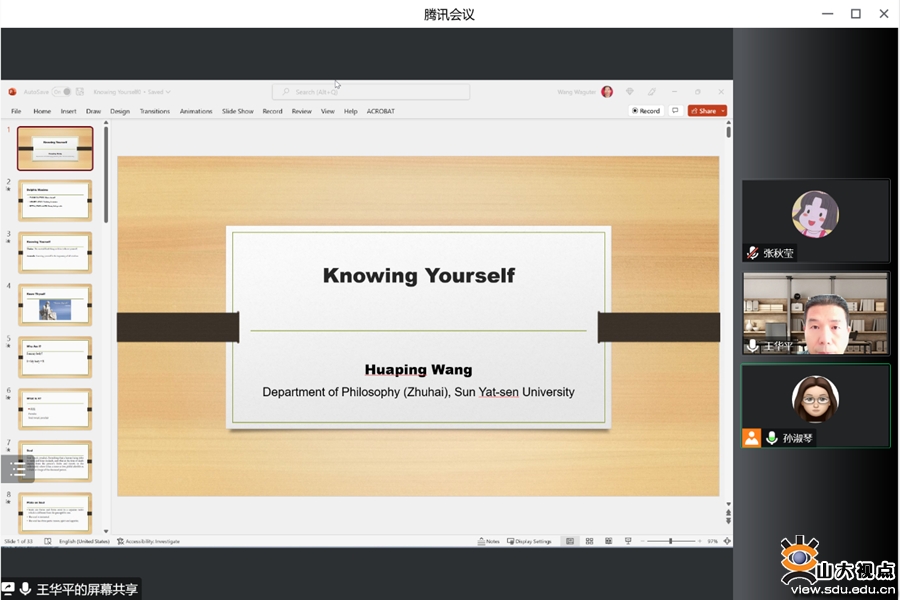 [本站讯]10月14日下午,山东大学经济学院第十六期PPE讲座以线上形式举行。中山大学哲学系(珠海)教授王华平作了题为“Know Yourself”的报告。讲座由经济学院副院长孙淑琴主持。
