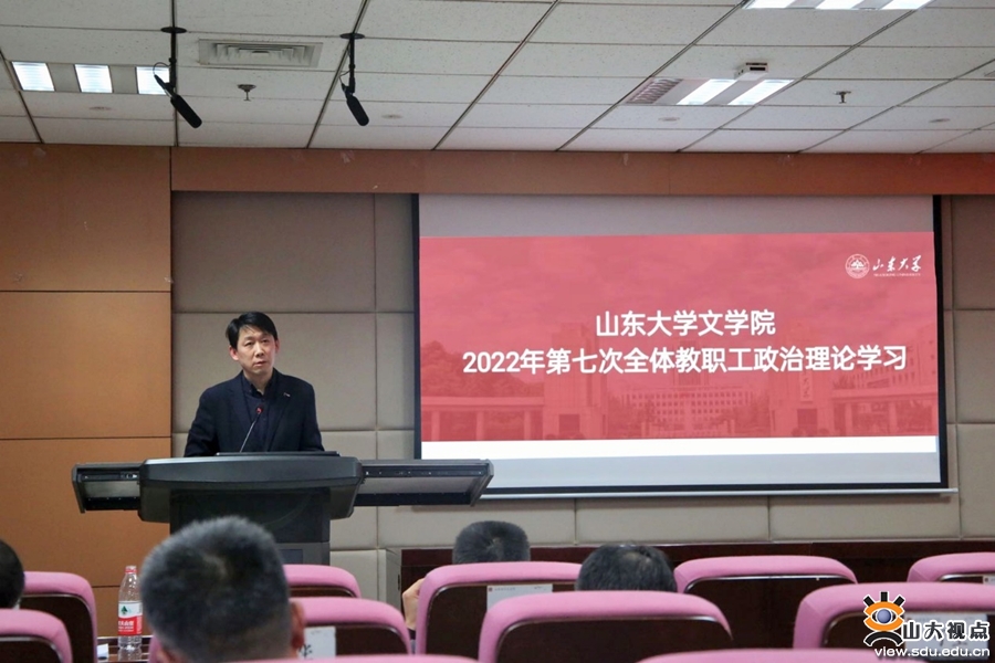 随后,张帅带领与会人员学习了报告中的新概念和新思路,传达了《中共山东大学委员会学习宣传党的二十大精神工作方案》,并结合学院工作实际提出几点要求:一是及时组织专题学习,充分发挥好党委理论中心组的引领和示范作用,院党委会每周安排一名领导班子成员领学,确保学习取得实效;二是分层分类推动学习,充分发挥党支部的战斗堡垒作用,重点抓好党员的学习,通过“三会一课”“主题党日”“组织生活会”等方式实现党员学习全覆盖。此外,文学院还要通过座谈讨论、辅导讲座、专题报告、主题班会、团日活动等多种形式,全面提升全体师生的理论学习质量。