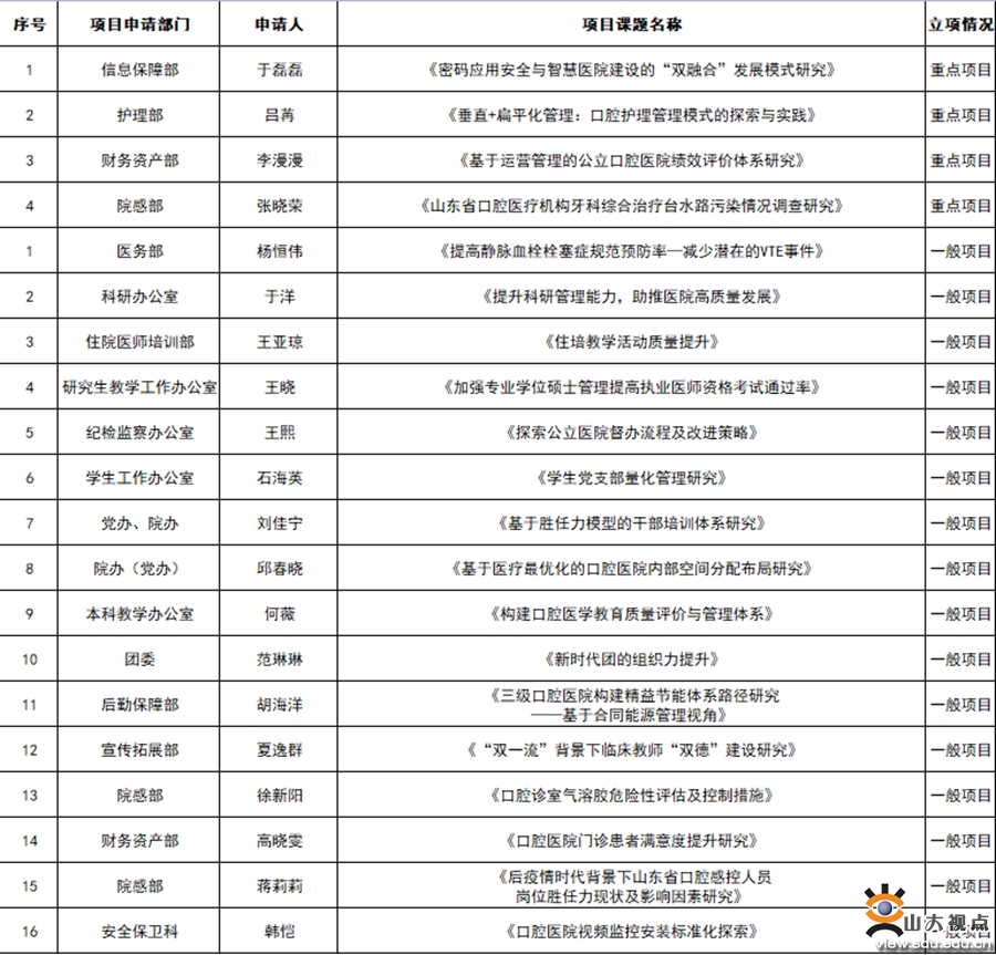 在解决实际问题、促进学院(医院)高质量发展上作功。“管理能力提升”项目申报要求紧密联系学院(医院)中心工作和发展实际,围绕高等教育、医疗卫生最新的政策法规,紧扣学院(医院)相关评审标准条件,展现现代化管理最新要求,立足本职工作,聚焦解决问题,结合日常工作中管理服务对象关注的焦点、亟需解决的重点难点、促进学院(医院)高质量发展的关键点进行研究实践探索。20个被立项的项目既有围绕专业理论的课题研究,又有聚焦具体工作的创新实践:有的聚焦医院信息化建设,探索密码应用安全与智慧口腔医院建设的“双融合”发展模式;有的立足立德树人,围绕提高执业医师资格考试通过率、构建口腔教学管理评价体系等提升教学管理能力和教学质量;有的着眼于精细化管理,思考进行视频监控安装标准化研究、精益节能体系路径研究、运营管理绩效评价研究,应用于工作实际;有的着力打造亮点品牌,凝练出适应口腔特色的“师德师风、医德医风”建设、护理管理模式、督办工作流程和感控举措。经过评选,4个项目被确立为重点项目,16个项目被确立为一般项目。