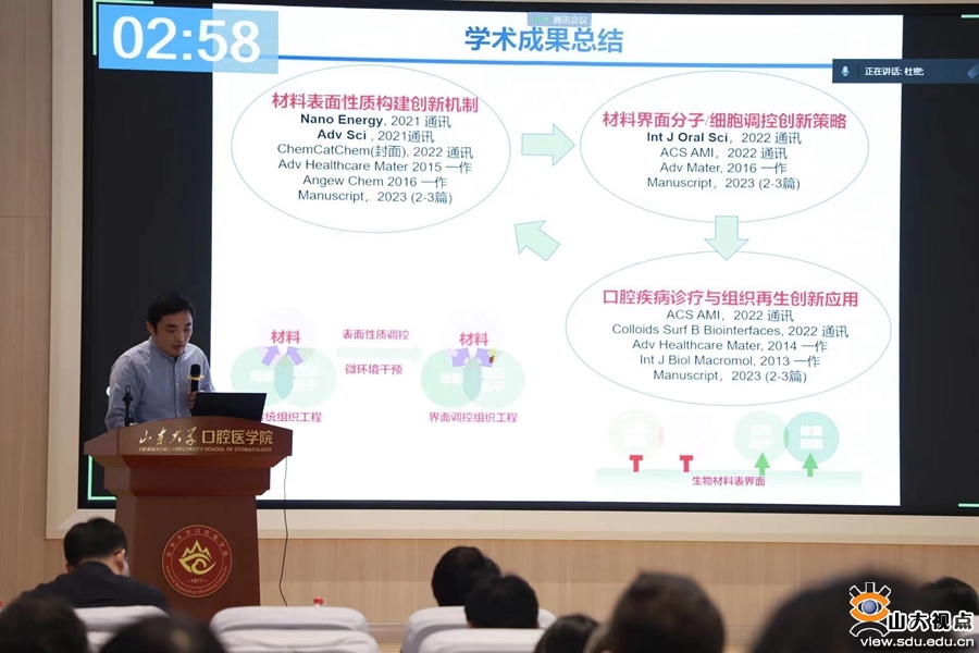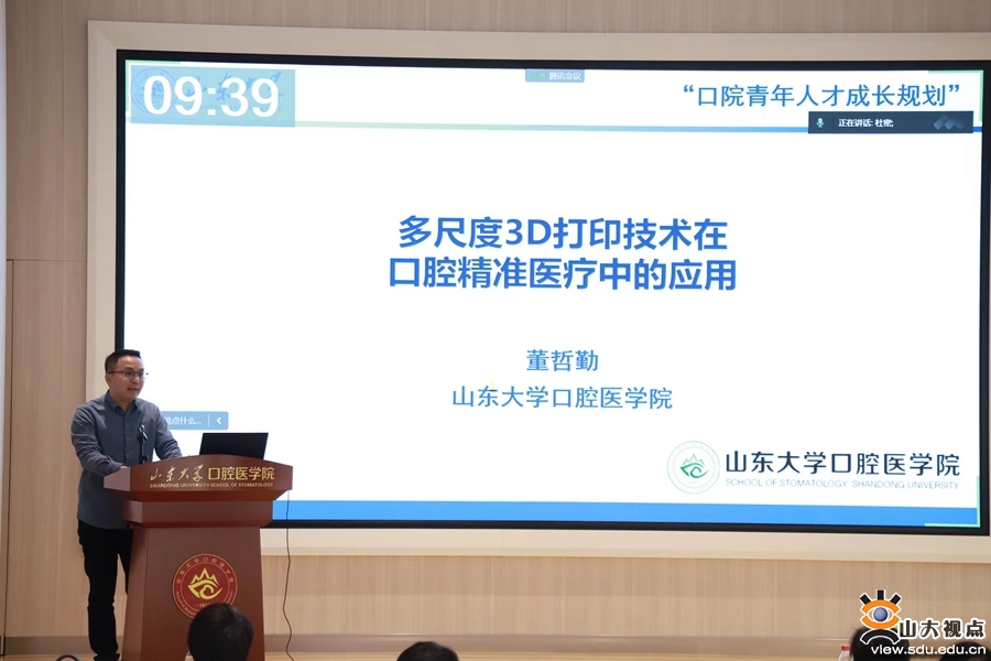 会上,冯强、李建华、马保金、董哲勤等分别以“口腔微生态引发口腔疾病的致病机制”“生物材料界面调控口腔组织修复”“生物活性离子-生物活性分子相互作用构建功能材料用于牙周炎治疗和组织修复”“多尺度3D打印技术在口腔精准医疗中的应用”为题进行专题汇报。预聘制教师也分别结合各自科研等工作开展情况、存在的问题及下一步工作计划进行了汇报。三位点评专家针对青年人才汇报的内容,从学科交叉融合、科研工作创新、研究方向凝练、成长发展路径等角度给予了专业的点评与指导。青年人才们纷纷表示,活动的组织促进了相互之间的交流,专家点评聚焦问题、导向清晰,对自己个人未来成长大有裨益。