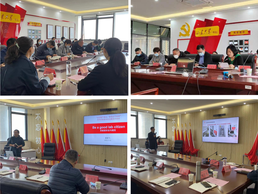 [本站讯]为深入学习贯彻党的二十大报告中关于总体国家安全观的重要精神,落实学校“119消防安全教育月”活动,11月9日上午,环境科学与工程学院生物与材料党支部开展“安全重于泰山,防患必于未然”实验室安全主题党日活动。青岛校区资产与实验室管理处处长王曙光、科长魏凤华,公共(创新)实验教学中心周雪冬,环境学院党委书记刘健、副院长袁宪正、党委副书记桑伟林等出席活动。生物与材料党支部书记赵珊主持活动。