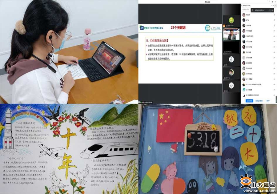 党的二十大开幕当天,药学院全体本科生在报告厅、教学楼大厅、自习室、宿舍等地线上观看,第一时间学习党的二十大报告内容,深刻感悟报告的历史穿透力、思想引领力和政治动员力。