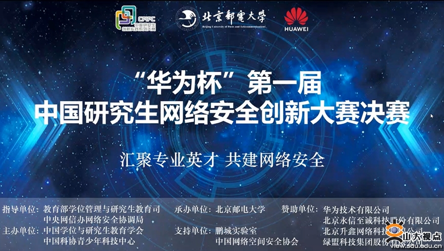 [本站讯]11月27日,“华为杯”第一届中国研究生网络安全创新大赛颁奖大会线上举行。山东大学网络空间安全学院王美琴教授指导的“学密码有前途”团队、鞠雷教授指导的“five”团队获创新作品赛全国一等奖,郭山清教授指导的“VME50KFC”团队获实网对抗赛全国二等奖,王美琴、鞠雷获评优秀指导教师,山东大学获优秀组织奖。