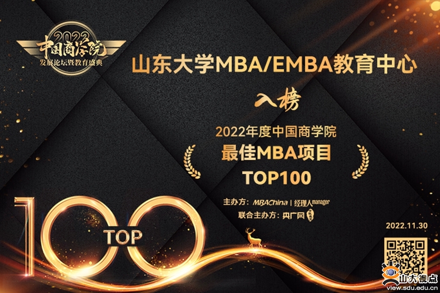 山东大学MBA/EMBA教育中心荣获“2022年度中国商学院最佳MBA项目TOP100”