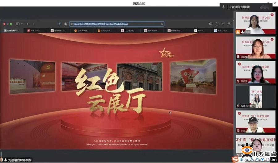 人民网红色云展厅则借助于5G云技术,将各地革命博物馆、纪念馆、党史馆、烈士陵园等内容数字化,形成红色媒资库,献礼建党百年。宣讲团成员重点观看了山东红色云展厅,直观感受从革命时期到新中国建立之后的奋斗历程,深入了解中国共产党为中华民族作出的伟大贡献和重大成就,以史为镜、以史明志,进一步激发为实现中华民族伟大复兴而奋斗的信心和动力,接过历史的接力棒,努力在新时代将党和人民事业推向新的历史高度。