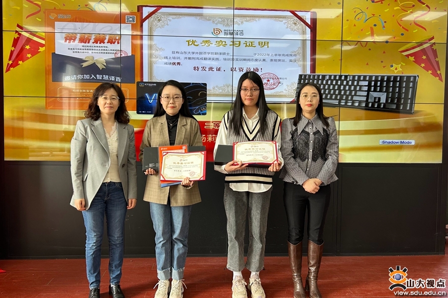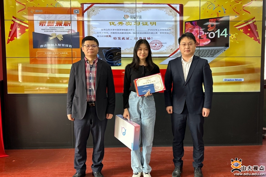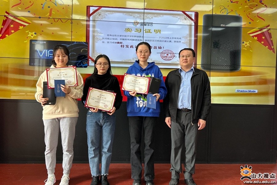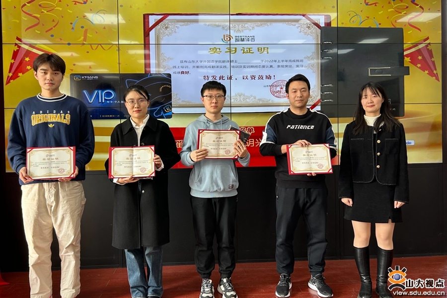 [本站讯]3月9日下午,山东大学外国语学院与山东智慧译百信息技术有限公司MTI实习实训结业仪式在洪家楼校区举行。山东智慧译百信息技术有限公司CEO江心波、多语总经理李金翠、校企负责人季相娣,山东大学外国语学院副院长马文、党委副书记刘华和MTI中心主任郑春光出席本次活动。
