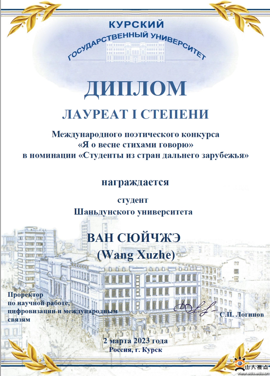 此外,在去年12月30日举办的第三届“相约上合杯”俄语大赛决赛中,王旭哲在激烈的角逐中脱颖而出,以高校组成绩第一名获得决赛一等奖,山东大学荣获优秀组织奖。“相约上合杯”俄语大赛是在山东省人民政府外事办公室、山东省教育厅指导下,由中俄(山东)教育国际合作联盟、山东省翻译协会、上合示范区管委会主办,中俄(山东)教育国际合作联盟秘书处、中国—上海合作组织地方经贸合作示范区共同组织承办的省级赛事,是为上合示范区建设提供俄语人才储备和智力支持的重要举措。2020年至今,大赛已连续举办三届,参赛学校和选手数量逐年增加,累计有国内120多所学校630余名选手参加,比赛为俄语人才培养与储备提供了新思路与新平台。