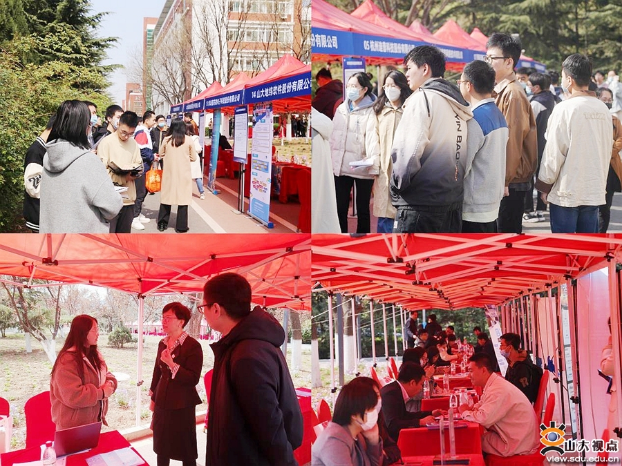 与此同时,在山东大学软件园校区操场跑道,专场人才对接会正如火如荼进行。36家涵盖软件、电力、智能设备、云计算、数据科技、通讯、芯片、机械制造等行业领域的优质企业携近千个工作岗位与2000余名学生进行深入对接,开启了一场产业与人才的“双向奔赴”。活动现场,毕业生同学们主动咨询岗位相关情况,投出简历并进行现场面试。其他年级学生积极参加,主动了解当前行业和产业发展形势与招聘条件。