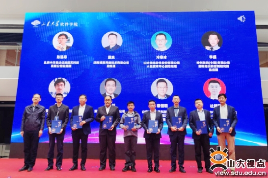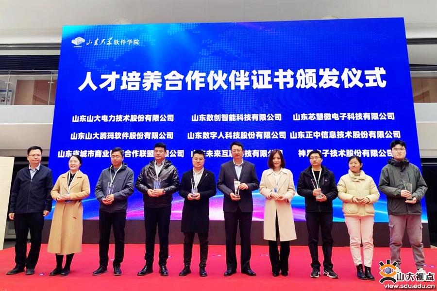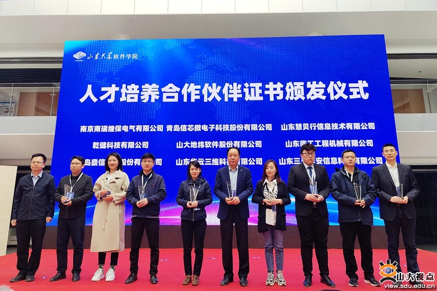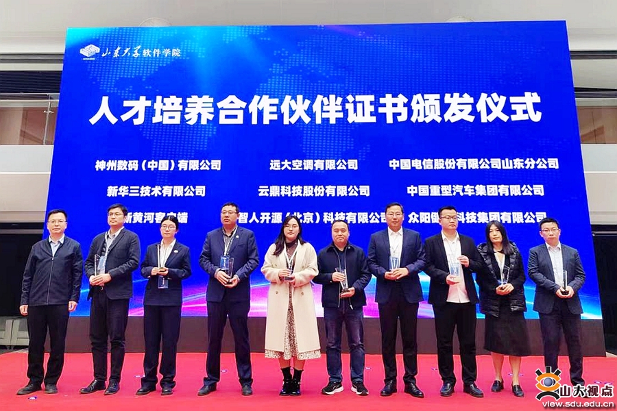 服务山东办公室、合作发展部副主任、副部长王震为36位软件学院人才培养合作伙伴颁发证书。