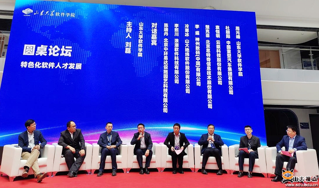 接下来,北京中环易达设施园艺科技有限公司总经理陈瑞丹、浪潮软件科技有限公司副总经理李照川、山大地纬软件股份有限公司人社中心副总经理冷寒冰、中国重型汽车集团数据工程中心数字化推进部副部长杜朝阳、北京思特奇信息技术有限公司产品线总经理楚克喜、神州数码通明湖云和信创研究院总经理李盛、山东能源集团云鼎科技党委组织部副部长袁恒明、山东大学软件学院副院长周元峰围绕“产业需求优化培养模式,专业特色激发创新能力”召开圆桌论坛。嘉宾们依次介绍本单位概况及对本次峰会的期望。软件学院副院长周元峰介绍当前信息技术发展趋势下学院对于软件开发人才培养模式和体系的创新举措。嘉宾们从各自的业务领域和视角出发,纷纷表达了对软件人才培养的建议与看法,大家就在数字经济背景下要继续深化校企合作,着力培养与软件功能和构建技术更新变革相适应的可用人才达成了共识。