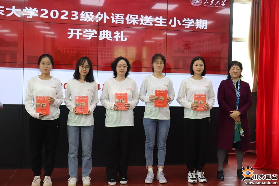 典礼上,徐延宝简要介绍了山东大学的历史发展情况、人才培养优势和育人目标,表达了对保送生新生们未来发展的殷切希望。王俊菊从外国语学院院史出发,讲述了学院90余年走过的峥嵘岁月及流淌在外院人血液中的红色基因,介绍了学院近年来的突出成就、现今山东大学外语学科的强劲实力、优美的校园环境和学院文化,并分享外院知名校友及优秀学子的事迹,激励大家立志高远、励志成才。2021级学子王馨琪作为保送生老生代表发言。她回忆了自己在小学期中的收获,建议同学们把握好与优秀的老师交流的机会,体会魅力外院的精彩无限。2023级保送新生代表贾涵月表达了对山东大学的向往和憧憬,并表明将以饱满的热情、坚定的信心、高度的责任感去迎接新的挑战,以语言为桥,以世界为舞台,传播中国自信的声音。随后,到场嘉宾向保送生新生赠送图书。