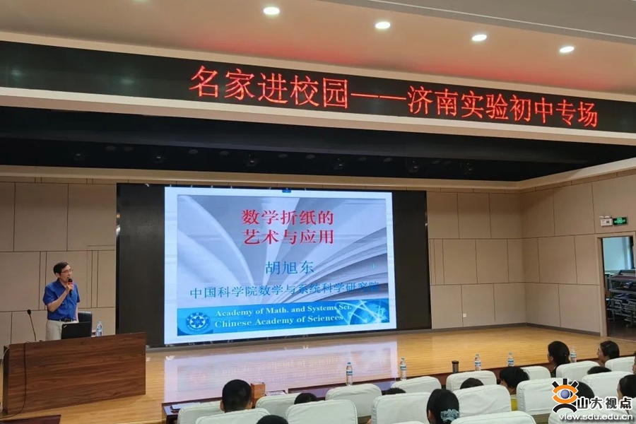 中国科学院数学与系统科学研究院教授胡旭东为济南大学附属中学(舜文)和济南实验初中的师生们带来“数学折纸的艺术与应用”主题报告。胡旭东教授用富有时代感的实例、生动形象的图片、幽默风趣的语言,深入浅出地为同学们讲解了折纸几何学的基本原理和在解决尺规作图难题中发挥的作用,以及折纸技术在太空科技、汽车安全、建筑学、机器人技术、制造业和医药业等许多领域中的应用。山东大学数学学院教授王明强、副教授谭蕾分别为济南市泉海学校和泉景中学的学生们讲授了密码和图形中的数学知识,通过科普讲解让同学们更好地理解数学的重要性和实用性,感受数学知识的神奇和魅力。