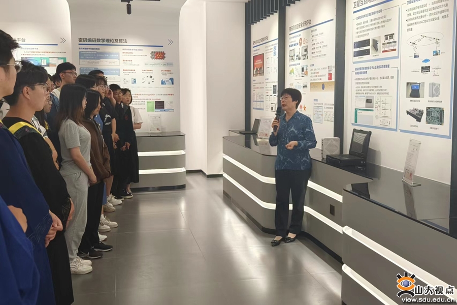 王小云带领学生参观了学院教学科研成果展厅。在序曲部分,她与同学们一一回顾了诺伊曼、香农、图灵、哈代、蒂奇马什等世界科学家的成就,重点介绍了闵嗣鹤、潘承洞等著名科学家的科研故事,勉励同学们以科学家为榜样,投身未知世界的探索,为人类社会进步作出贡献。在成果展厅,她深情回顾了山东大学密码学的发展历程,带领同学了解了网络空间安全学院建院以来在教学科研、创新创业、校企合作等领域取得的成就,参观了学院教师重大成果手稿墙、分享了手稿背后的科研故事,着重介绍了“区块链关键安全技术研究”“人工智能安全与数据隐私保护研究”等13个学院重大教学科研平台,和同学们一起体验了“黑客改号”“移动充电宝攻击”等科普区域。
