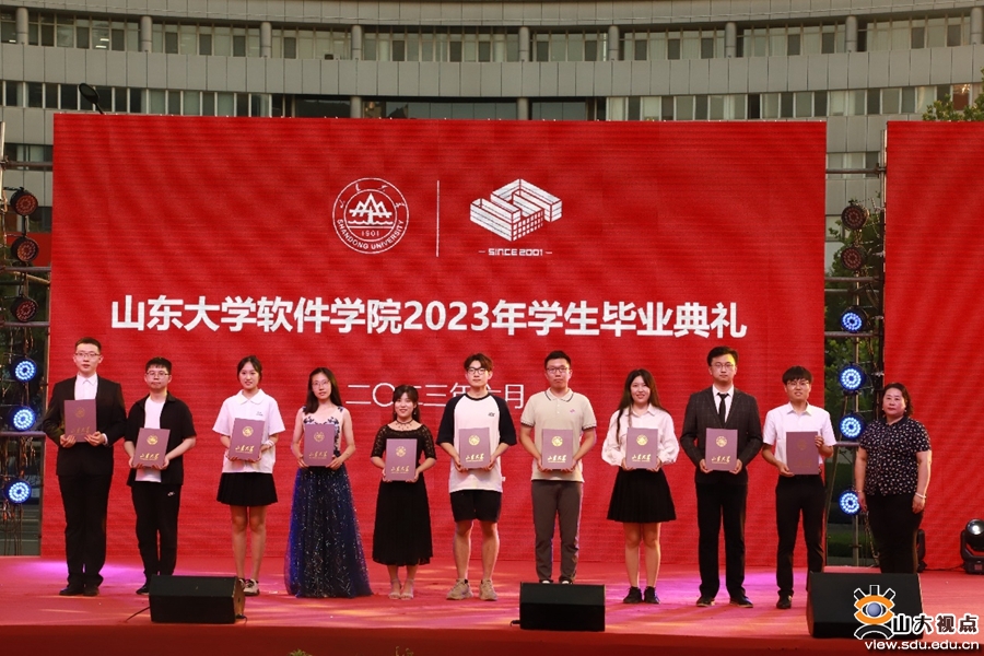 下午17时,典礼在庄严的国歌声中拉开序幕。许信顺宣读软件学院2023届优秀学生典型人物名单,王秀丽为获奖学生颁奖。