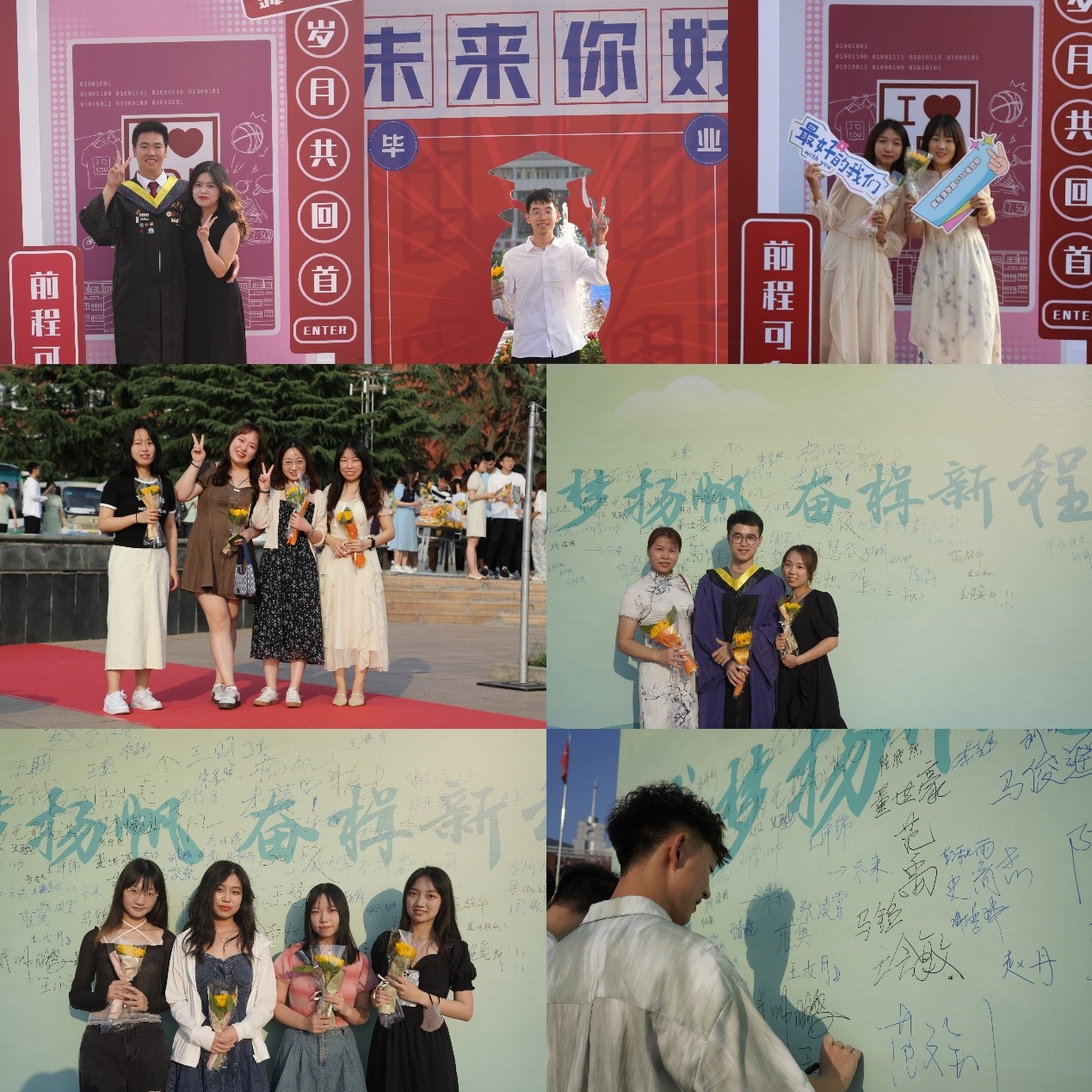 在毕业典礼开始前,学院为毕业生们准备了红毯仪式。2023届毕业生们与家长、朋友、老师一起走过红毯合影留念,在签名墙上写下自己的寄语与祝福,品尝甜点美食,手拿鲜花拍照打卡,作别大学校园生活,开启人生新的篇章。