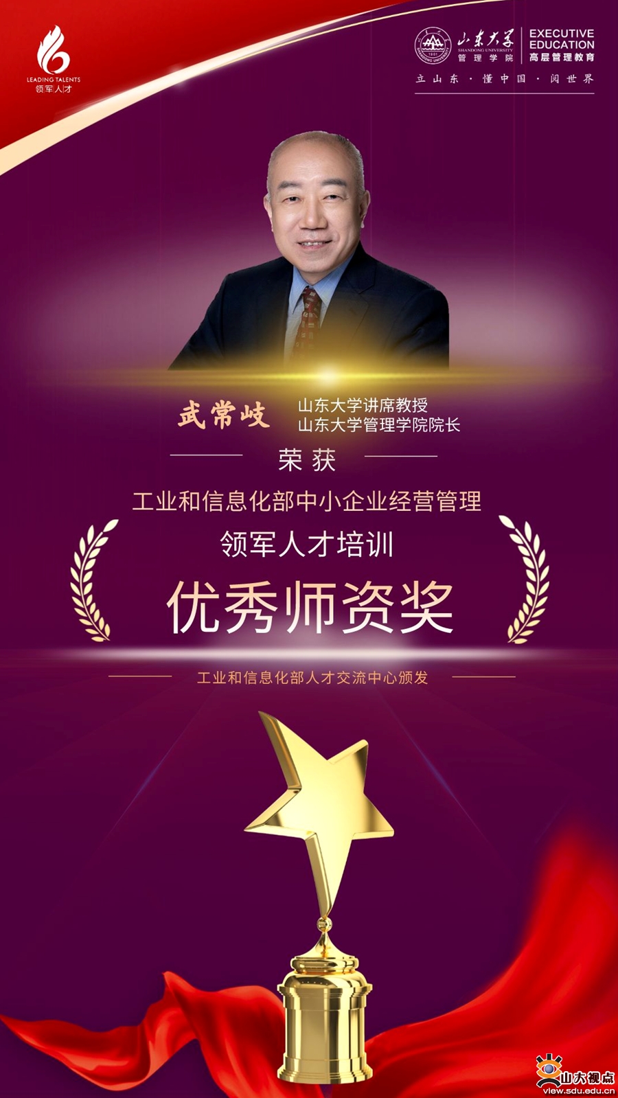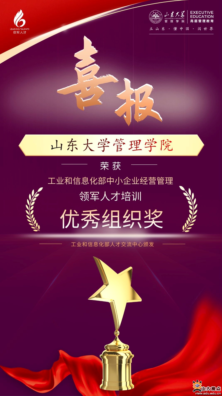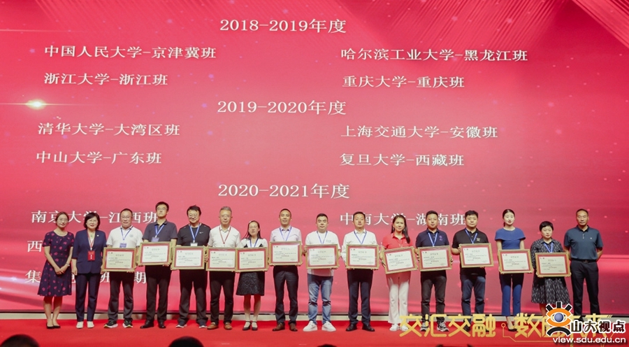 山东大学在工业和信息化部中小企业经营管理领军人才培训项目中荣获系列奖项。其中,山东大学管理学院获优秀组织奖,山东大学管理学院院长武常岐获2020-2021年度优秀师资奖,山东大学-青岛班获2020-2021年度优秀班集体,山东大学管理学院高层管理教育项目总监于潞获2020-2021年度优秀班主任奖,山东省轻工集体企业联社企业服务部、山东省中小企业发展促进中心(主管单位)获突出贡献奖。山东大学获“奋进十载·荣启未来”诗词、对联优秀组织奖,2020-2021年度山东大学-青岛班学员宫清远获“奋进十载·荣启未来”摄影作品二等奖,2020-2021年度山东大学-青岛班学员刘海涛获“奋进十载·荣启未来”诗词、对联作品优秀奖。此外,山东大学领军人才项目2020-2021年度山东大学-青岛班共有6人入选2020-2021年度领军企业家联谊组织理事会。