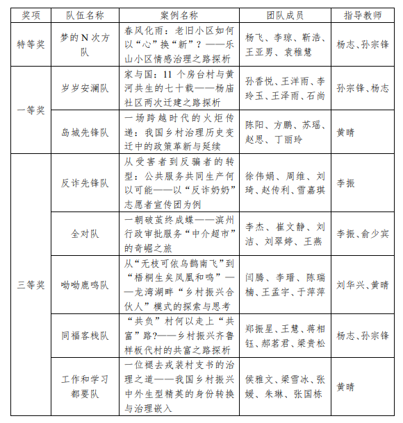自本届大赛启动以来,山东大学MPA学子以高昂的参赛热情与饱满的工作积极性,潜心备赛。经过评审专家严格审阅,山东大学共有8支队伍入围决赛。最终,在指导老师与参赛队员的共同努力下,山东大学代表队斩获佳绩。其中,由黄晴老师指导的《一场跨越时代的火炬传递:我国乡村治理历史变迁中的政策革新与延续》,获得大赛唯一“最佳案例奖”,杨志老师荣获“最佳指导教师”称号,学生王泽雨荣获“最有价值队员奖”。