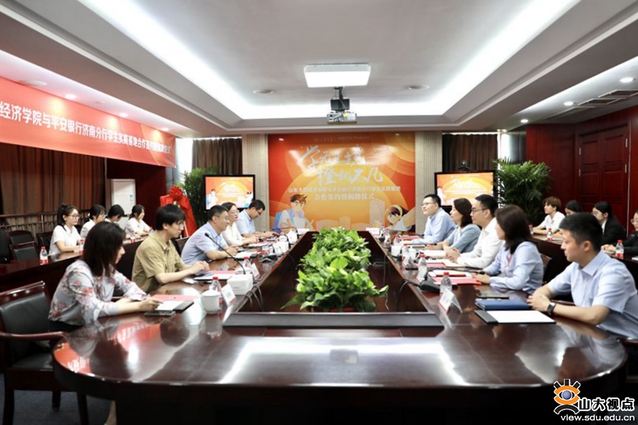 [本站讯]7月20日,经济学院与平安银行济南分行学生实践基地共建签约暨揭牌仪式举行。平安银行北区公司业务总监、济南分行党委书记、行长王珺,济南分行党委委员、行长助理杨光,经济学院党委书记董春杰、党委副书记林竹出席仪式。