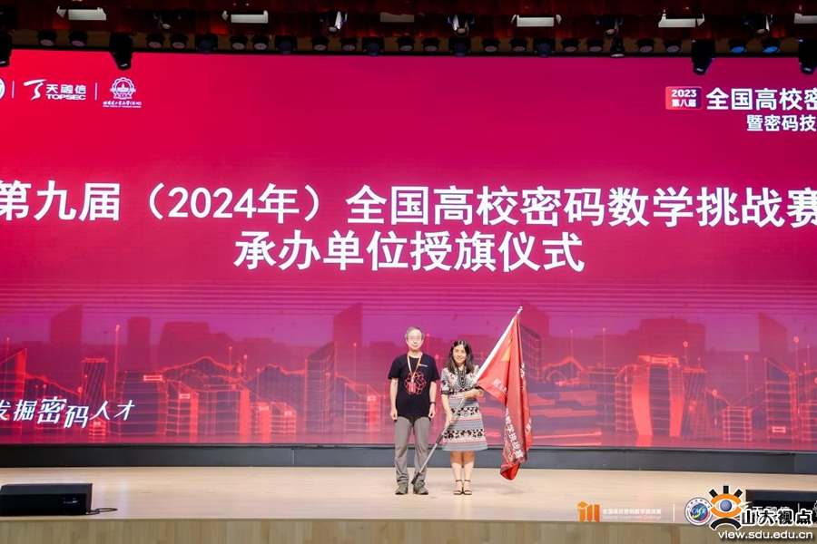 会上进行了第九届(2024年)全国高校密码数学挑战赛承办单位授旗仪式,本届赛事将由山东大学网络空间安全学院承办,王美琴接受授旗。