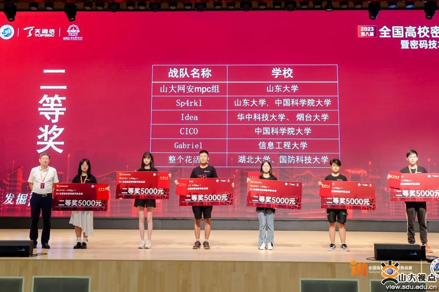 本次赛事以“展示数学魅力,发掘密码人才”为宗旨,面向各高等学校具有正式学籍的全日制在校本科生、硕士生与博士生展开,共有来自全国100余所高校的220余支队伍,总计600余名选手报名参赛。经竞赛专家委员会权威审议,共评选出42支队伍晋级全国线下总决赛。山东大学网络空间安全学院研究生组成的五支队伍进入决赛,与来自全国的优秀学子同台竞技。最终,经过线上及线下公开答辩、现场公开提问、专家集中审议等环节,由崔龙正带领的“山大网安mpc组”战队(指导教师:孙玲研究员)和姜博文带领的“Sp4rkl”战队(指导教师:魏普文教授)获得二等奖;由吴文慧带领的“取个名字吧”战队(指导教师:孙玲研究员)、刘群带领的“学密码有前途”及陈静雯带领的“密道突击队”战队(指导教师:樊燕红副研究员)获得三等奖。