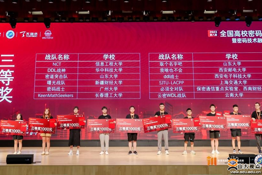 [本站讯]8月15日,由教育部、中央网信办指导,中国密码学会密码数学理论专业委员会、教育部高等学校数学类专业教学指导委员会、天融信科技集团联合主办的第八届(2023)全国高校密码数学挑战赛总决赛在深圳落下帷幕。山东大学网络空间安全学院学子在大赛中获佳绩,共获全国二等奖2项,全国三等奖3项。中国科学院院士、山东大学网络空间安全学院院长王小云,山东大学网络空间安全学院常务副院长王美琴出席颁奖典礼。
