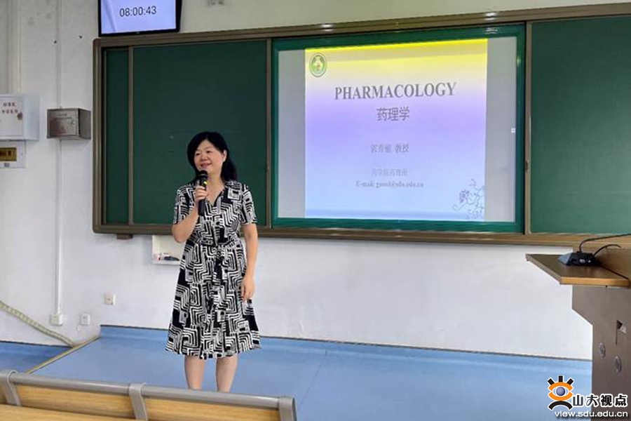 郭秀丽教授为2021级临床药学本科生讲授药理学课程。她讲道,金秋时节金色收获,希望同学们学好药理学,未来为“健康中国”战略担负起药学人的责任。