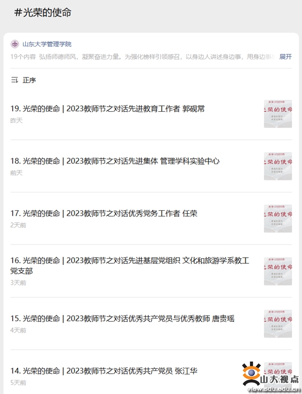 弘扬师德师风,凝聚奋进力量。9月,管理学院持续打造“光荣的使命”师德师风建设月主题活动,在企业微信、学院微信公众号等平台推出了“光荣的使命”系列视频,通过对话二十位学院优秀党务工作者与共产党员、先进教育工作者与优秀教师,强化榜样引领感召,弘扬“学为人师、行为世范”的教育情怀。学院将赓续为国育贤百廿初心,在强院兴校、强校兴国、全面图强的山东大学新征程中勇担培育时代新人的历史使命,为建设担当中华民族复兴大任的世界一流大学贡献管院力量。