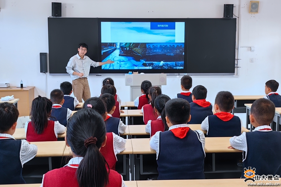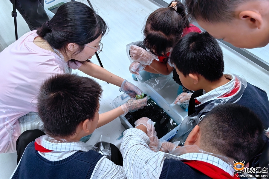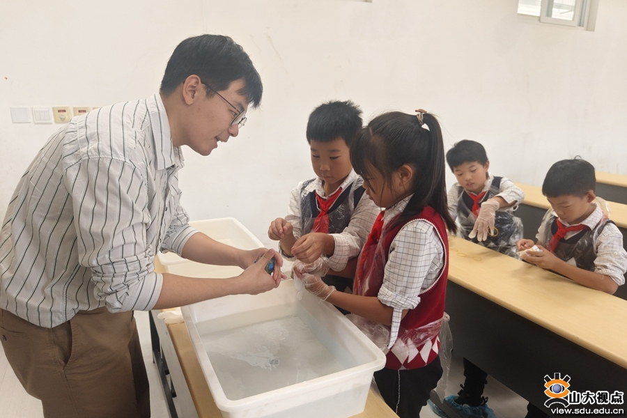 体验环节,学生们在课程助教的指导下利用皮筋等工具开始扎结方巾,制作属于自己的扎染作品。经过绞扎、浸泡、漂洗……短短半个小时,一件件构思绝妙的扎染方巾就在学生们手中诞生了。学生们互相欣赏点评着彼此的作品,被植物染的奇妙变化吸引,也特别崇拜来上课的哥哥姐姐懂这么多的知识,希望以后可以能够到山东大学读书,能够成为哥哥姐姐的校友。