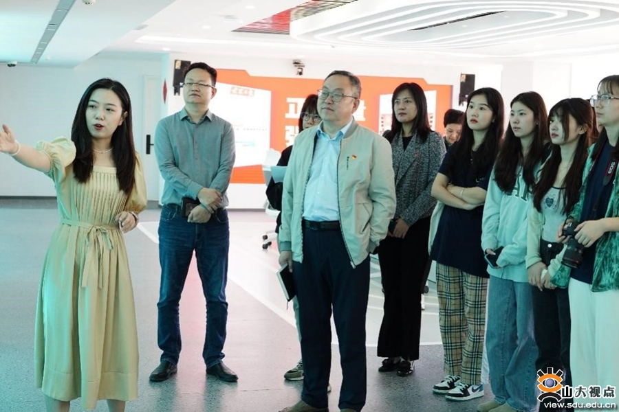 活动中,大众日报社交通记者站站长吴荣欣带领师生参观了大众日报社全媒体创新基地,实境感受新时代媒体文化传播建设氛围。山东大学校友李欣苁为师生介绍了大众日报社全媒体组织架构、创新性媒体融合机制以及全媒体生产传播矩阵。大众日报社坚定文化自信,秉持开放包容,坚持守正创新,适时建立山东青年云平台、山东党建云平台,推出多个重点栏目和热门活动,微信公众号关注量稳居省报首位,在行业内遥遥领先。报社人对事业孜孜以求、精益求精的精神面貌给师生留下深刻印象。