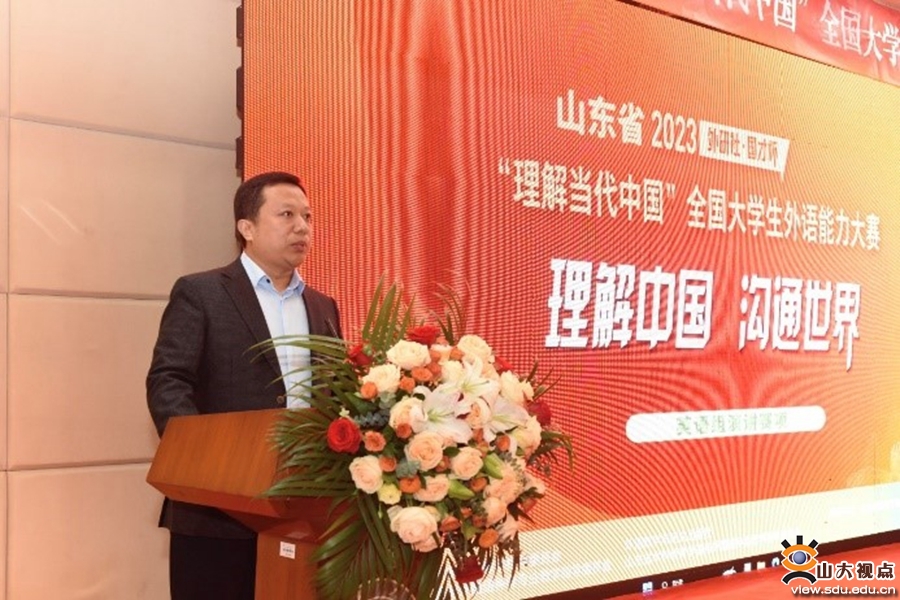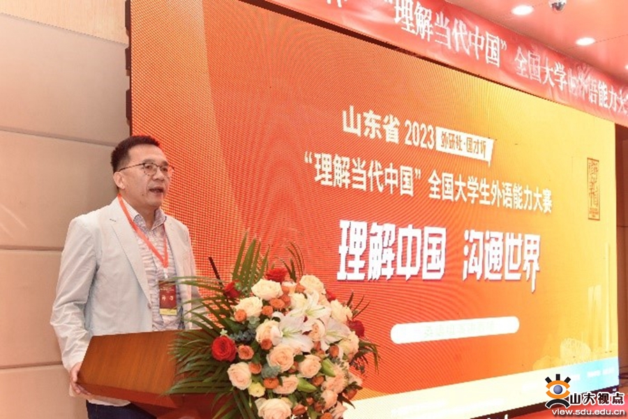 山东省大学外语教学指导委员会主任委员、曲阜师范大学教授王广成,山东省通用语类教学指导委员会主任委员、山东大学外国语学院院长王俊菊先后在致辞中强调了本次大赛对纵深推动“三进”工作、有效促进高校外语教学改革以及培养新时代拔尖创新外语人才的重大意义。他们希望参赛选手可以贯彻比赛主题——“理解中国,沟通世界”,充分展现新时代大学生的精神风貌,自信展示山东学子的独特风采,争做新时代外语人,担当起讲好中国故事、传播好中国声音的历史重任。