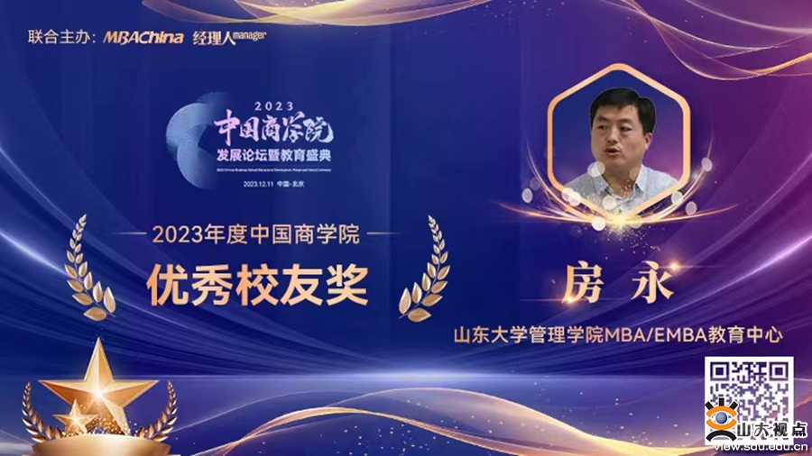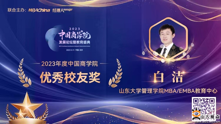 盛典现场,山东大学MBA/EMBA教育中心荣获“2023中国商学院最佳MBA项目TOP100”(位列TOP23)、“2023年度中国商学院新媒体影响力”(位列TOP17);山东大学管理学院院长、MBA/EMBA教育中心主任武常岐荣获“2023年度中国商学院杰出院长奖”;山东大学MBA/EMBA教育中心执行主任刘冰荣获“2023年度中国商学院卓越运营奖”;2016级MBA1班白洁、房永两位校友荣获“2023年度中国商学院优秀校友奖”。