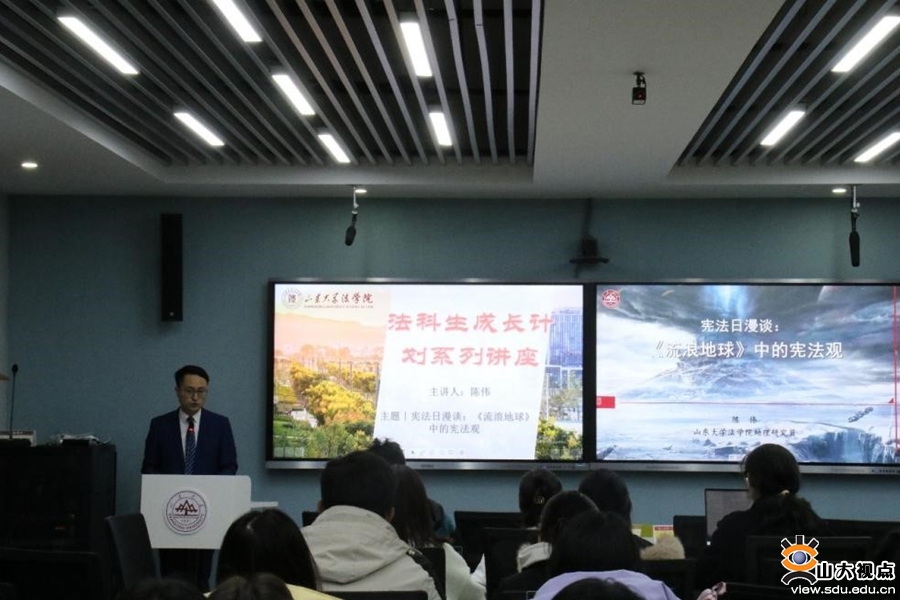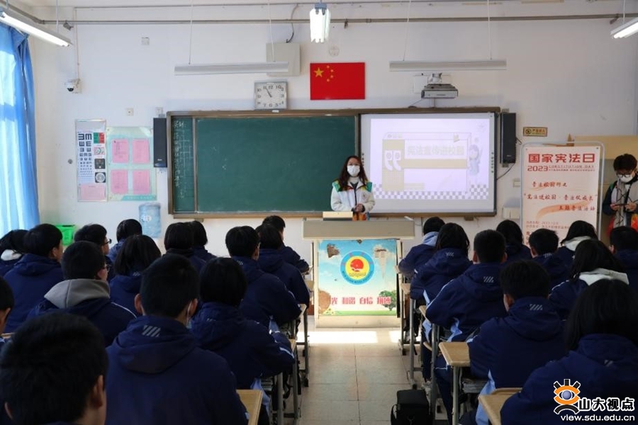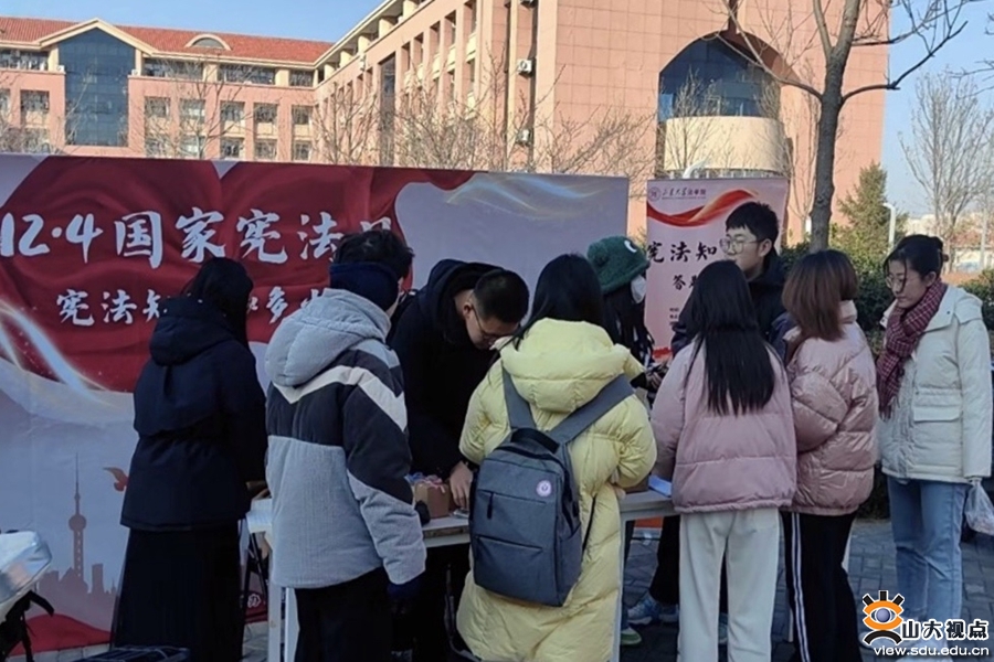校园普法弘扬宪法精神。12月4日,山东大学学生法律援助中心志愿者前往青岛超银学校崂山校区,为七年级学生开展校园普法活动。志愿者结合初中生的身心发展特点,用通俗易懂的语言向学生解读宪法权利和义务的关系,通过真实案例阐释相关法条,讲解面对校园霸凌的正确态度和处理方式,提升中学生自我保护意识,为创建安全、和谐、文明的校园环境,保障学生的健康、快乐成长提供法律保障。法学院学生会实践服务部组织志愿者队伍,前往即墨区温泉中学开展“宪法进校园·普法促成长”活动。志愿团队走进课堂发放宪法知识宣传手册、展示宣传海报并开展普法讲座,推进“双向沟通”的志愿服务模式,在法律知识问答环节与学生积极互动,在具体生动的情境中让学生充分了解宪法所赋予的选举权、受教育权、财产权等基本权利内容,增进青少年对于宪法的政治认同、思想认同和情感认同。在山大校园内,法学院助理研究员陈伟举办“宪法日漫谈” 座谈会。他以“”《流浪地球》中的宪法观”为题,从宪法遇上时间刻度、谁是宪法的守护者、如何实现代际合题、列举未竟话题等四个方面展开分享。他引导学生思考原著中的《危急法》可能涉及的具体规定,并以《流浪地球》电影中的智能量子计算机MOSS和原著中的联合政府为例,阐释了“宪法守护者”的地位、功能和作用,从宪法监督的角度解读了“流浪地球”计划能够得以持续实施的原因,让学生深入思考宪法概念、宪法精神和宪法原理,提升新时代大学生宪法教育质效。