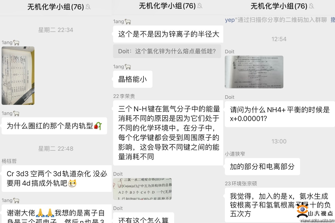 针对学习难度较大的无机化学、有机化学、物理化学等专业课,学院充分动员,遴选出一批学业优秀的学长学姐担任朋辈讲师,组成不同科目的学业辅导团。朋辈讲师与帮扶同学结成对子,“一对一”“多对一”开展学业帮扶,预约讲师进行面对面答疑交流。线上与线下齐头并进,各科目学业辅导团小组建立微信群聊,搭建交流互助平台,同学们在群内提出复习过程中遇到问题,学长学姐们针对所提问题进行解答,放大朋辈互助的连锁效应。