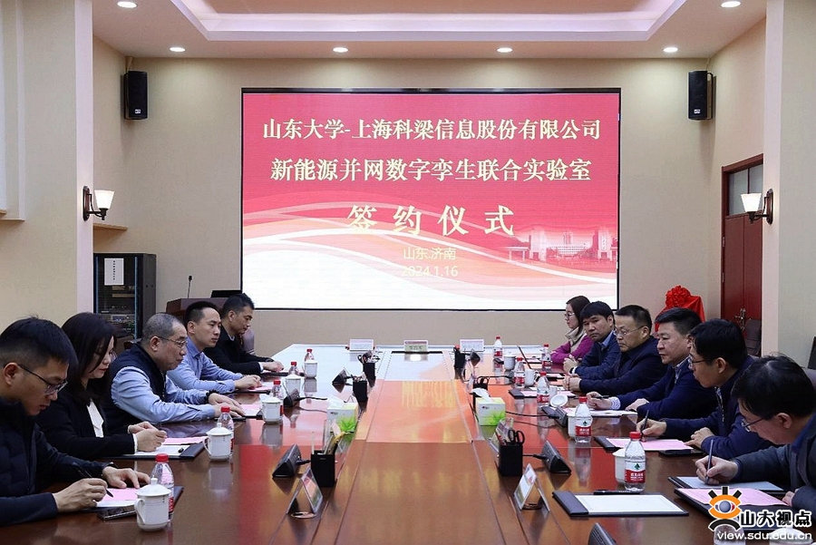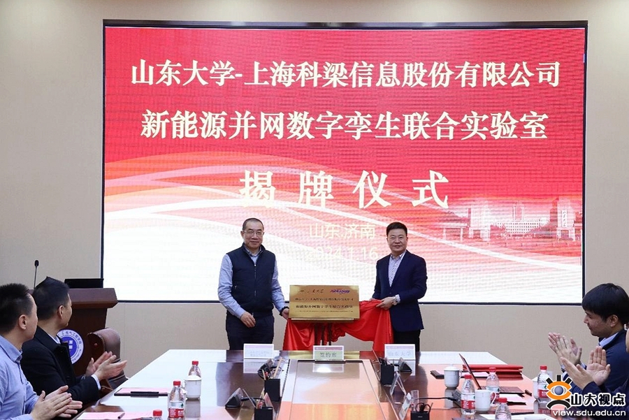 [本站讯]1月16日,山东大学—科梁信息新能源并网数字孪生联合实验室揭牌仪式在山东大学千佛山校区举行。山东大学副校长朱德建、上海科梁信息科技股份有限公司总经理桑苏明出席仪式并致辞。