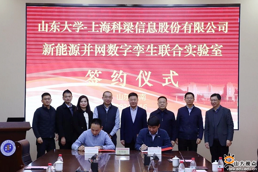 山东大学电气工程学院党委书记殷录民主持仪式。山东大学电气工程学院副院长赵浩然、上海科梁信息科技股份有限公司副总经理李鸿彪分别代表双方签署合作协议,朱德建与桑苏明共同为山东大学—科梁信息新能源并网数字孪生联合实验室揭牌。