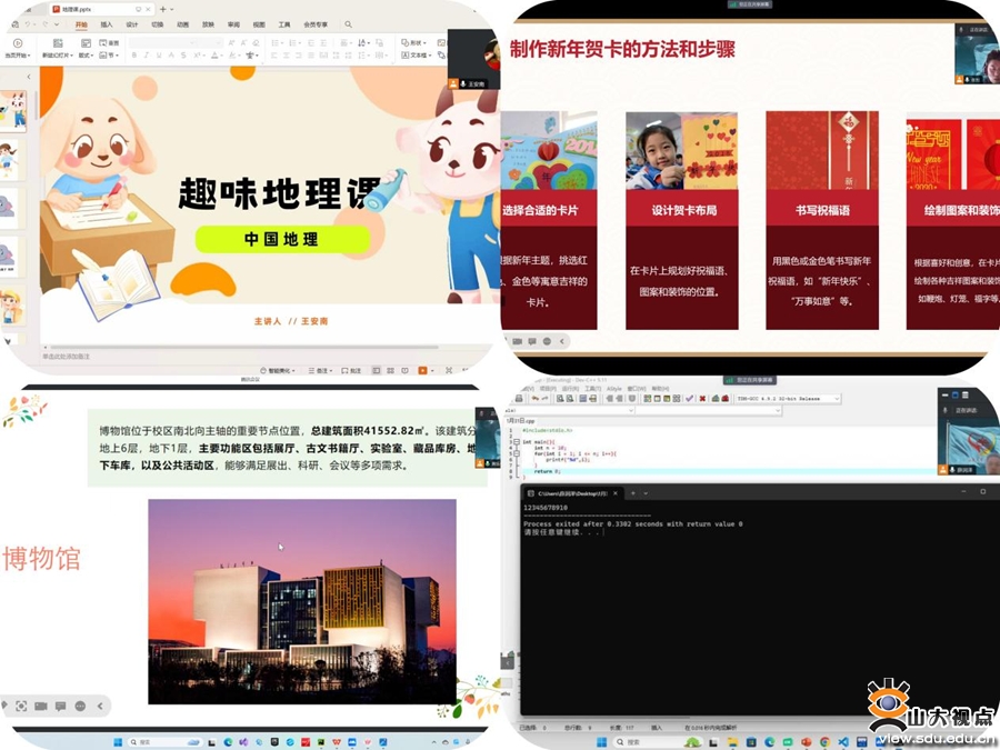 [本站讯]1月27日至2月5日,山东大学(青岛)学生生命彩虹支农支教调研协会与山东省菏泽市牡丹区都司镇周楼小学、山东省临沂市沂南县苏村镇小学、山东省菏泽经济开发区人民路中学开展合作,进行了2024年寒假线上支教活动。来自生命科学学院、法学院等7个学院的30名志愿者精心备课,与286名中小学生一起度过了10天美好时光。小学组和初中组累计开展支教活动468余个课时,出色地完成了预定目标。