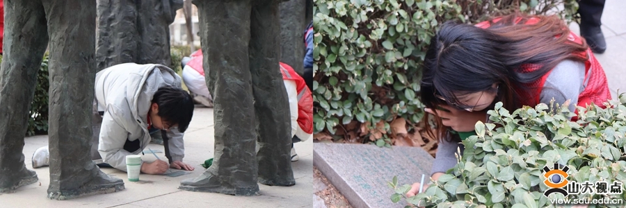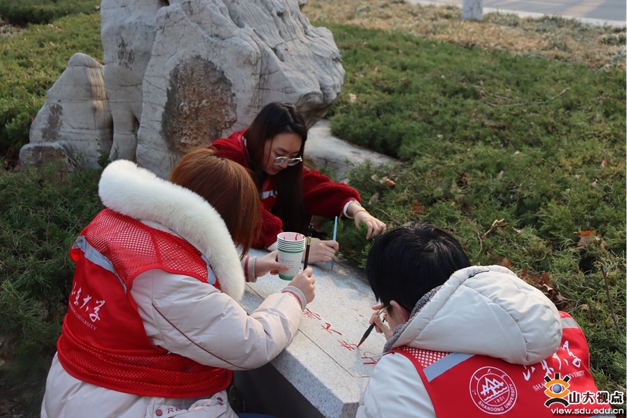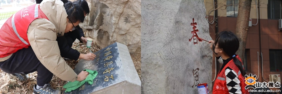 此外,志愿者先后对图书馆、邵逸夫科技馆、公教楼、文史楼、国际教育学院等地附近的景观雕塑进行了清洁,对石碑雕刻文字进行补色。经过志愿者们的共同努力,校园里景观碑刻的文字愈发闪亮。同学们用实际行动诠释了对雷锋精神的理解,进一步感悟山大人文情怀,让山大历史文脉在新时代山大青年中更好传承下去。