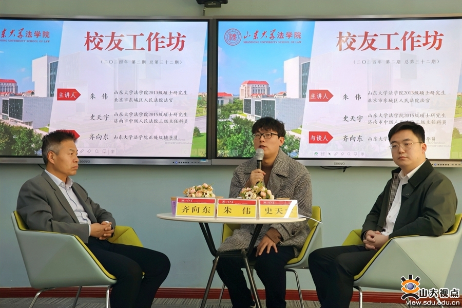 [本站讯] 3月16日,山东大学法学院举办第32期校友工作坊。本期校友工作坊邀请法学院2013级硕士研究生、现就职于北京市东城区人民法院的朱伟校友以及2015级硕士研究生、现就职于济南市中级人民法院的史天宇校友分享成长经历。法学院正处级辅导员齐向东担任与谈人。