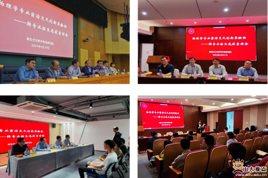 [本站讯]为做好拔尖创新人才培养,宣传物理学专业前沿交叉创新实验班办学特色,吸引更多优秀的本科生报考实验班,前沿交叉科学青岛研究院于4月19日、4月21日分别在青岛校区、中心校区、兴隆山校区举办三场转专业招生选拔宣讲会,来自济南和青岛的近百名学生通过线上或线下方式参加宣讲会。