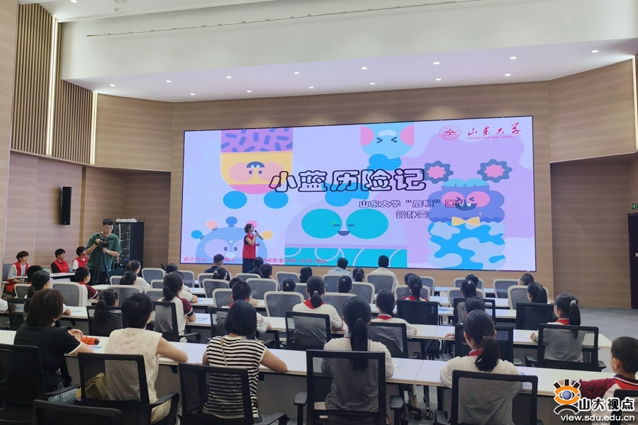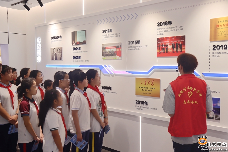 随后,启明支教团的志愿者带领书香小学师生参观了网络空间安全学院展厅。在序厅,志愿者为同学们讲解了香农、图灵、哈代、蒂奇马什等世界科学家的成就,着重介绍了闵嗣鹤先生、潘承洞先生等著名科学家的科研故事。在建设成果展厅,志愿者带领同学们回顾了山东大学密码学和网络空间安全学科的发展历程,并介绍了学院建院以来在教学科研、创新创业、校企合作等领域取得的显著成果。在互动体验区,志愿者带领同学们在虚拟环境中体验电信诈骗等网络安全事件,通过模拟操作,学习如何识别和防范这些网络安全威胁,极大地提高了同学们对网络安全问题的认识和应对能力。