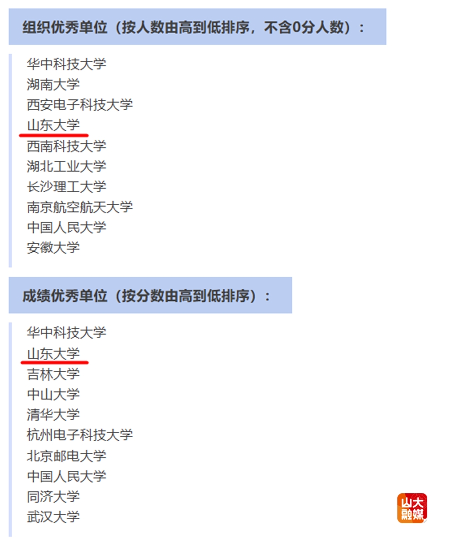 [本站讯]近日,中国计算机学会(CCF)公布了2024年度计算机软件能力认证(CSP)优秀单位评选结果,山东大学再次荣获“成绩优秀单位”和“组织优秀单位”两项殊荣。自2020年CCF开始对认证点高校开展年度评审以来,山东大学已连续五次在该项认证中获得双优荣誉。