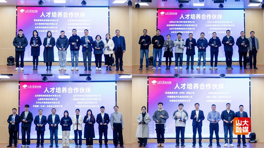 与会嘉宾代表为“山东大学特色化软件人才产教融合基地”揭牌,共同启动“山东大学软件学院校企联合攻关项目伙伴计划”。与会相关单位有关负责人,为54家2025年度软件学院人才培养合作伙伴授牌。