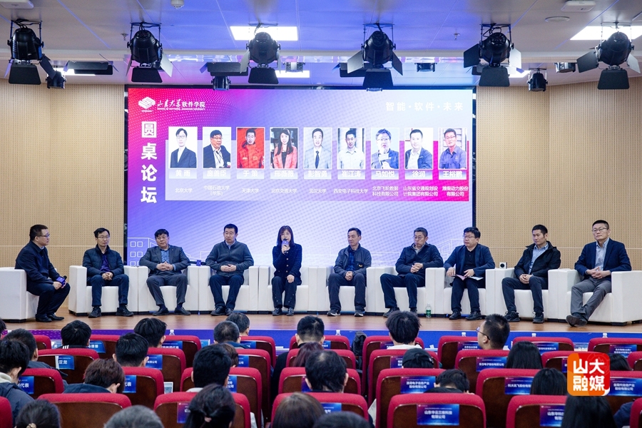 在“智能∙软件∙未来”圆桌论坛环节,武汉大学计算机学院彭智勇教授,西安电子科技大学计算机科学与技术学院执行院长崔江涛教授,北京交通大学教授、国家示范性软件学院联盟副理事长兼秘书长邢薇薇,天津大学智能与计算学部副主任于策教授,中国石油大学青岛软件学院、计算机科学与技术学院院长庞善臣教授,北京大学软件工程国家工程研究中心研究员黄雨,北京飞轮数据科技有限公司创始人兼首席执行官马如悦,山东省交通规划设计院集团有限公司科技研发中心主任、数字研究院院长徐润教授,潍柴动力股份有限公司电控与软件研究院副院长、潍柴动力科技有限责任公司副总经理王裕鹏,山东大学软件学院副院长刘士军教授围绕人工智能时代的软件产业人才需求与人才培养展开研讨。