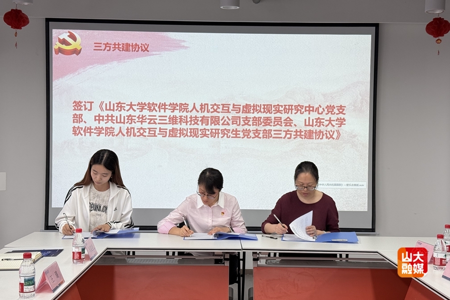 在共建协议签署仪式上,华云三维党支部、软件学院人机交互与虚拟现实研究中心党支部、软件学院人机交互与虚拟现实研究生党支部三方代表共同签署共建协议。旨在通过组织共建、人才共育、资源共享,打造“党建+科技创新”特色品牌,推动基层党建与业务发展深度融合。