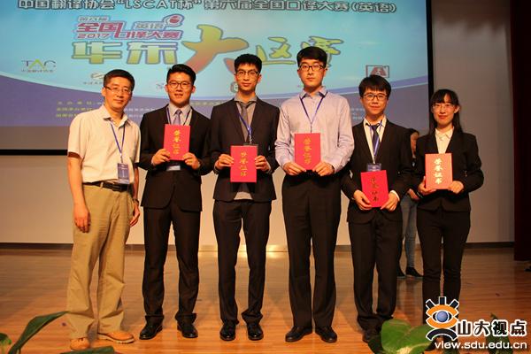 [本站讯]5月13日,第六届全国口译大赛(英语)华东大区赛在南京举行。经过激烈角逐,代表山东出赛的山东大学外语学院2015级口译方向研究生孟帅获一等奖,2015级口译方向研究生李原秋获二等奖,2015级口译方向的刘伟健、2016级口译方向的张新苑和自晗越分别获三等奖。