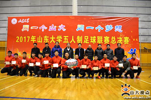 本届五人制足球联赛是学校首次在济南、威海、青岛三个赛区同时展开的体育联赛。联赛经过班级选拔赛、三地各校区预选赛、全校总决赛三个阶段。比赛覆盖全校三地各学院各班级,参与比赛人数达4000余人。经过前期选拔,来自学校济南赛区的体育学院、机械工程学院、管理学院、历史文化学院;威海赛区的数学与统计学院、空间科学与物理学院;青岛赛区的法学院、政治学与公共管理学院共8支优胜队参加了总决赛。经过为期两天的激烈角逐,体育学院获得总决赛冠军,政治学与公共管理学院和法学院分获亚军和季军。学校齐鲁医学院、公安处、威海校区体育部以及体育学院有关负责人参加活动。